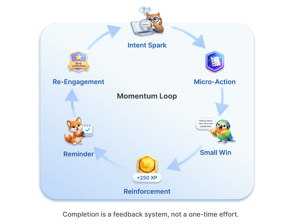 “The system can’t carry the learner from intent to completion, learners quit because nothing pulls them back in.”